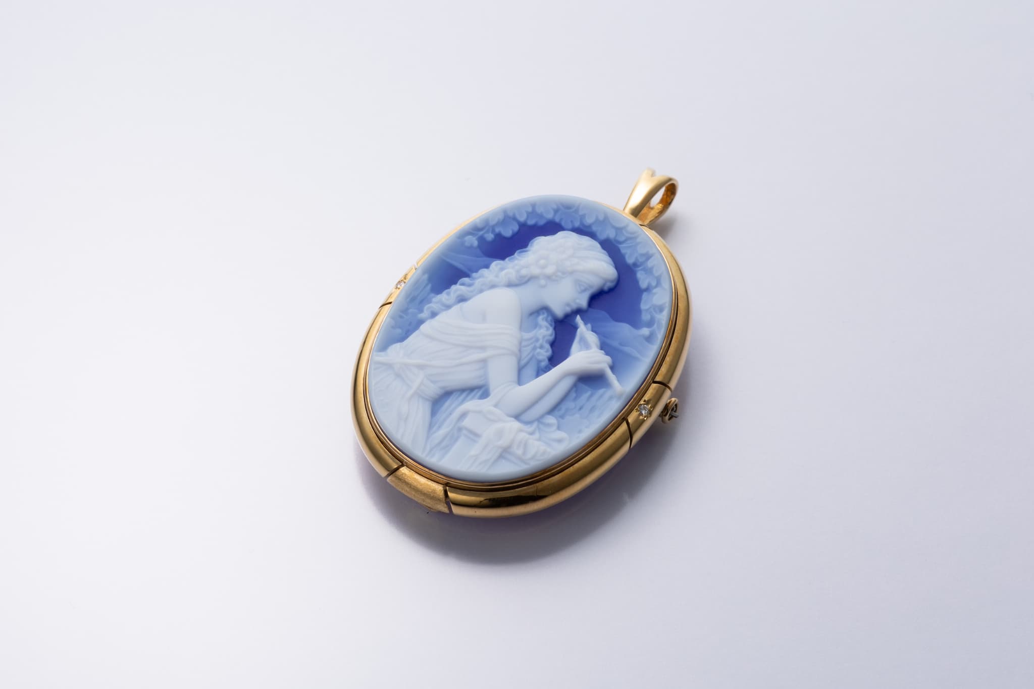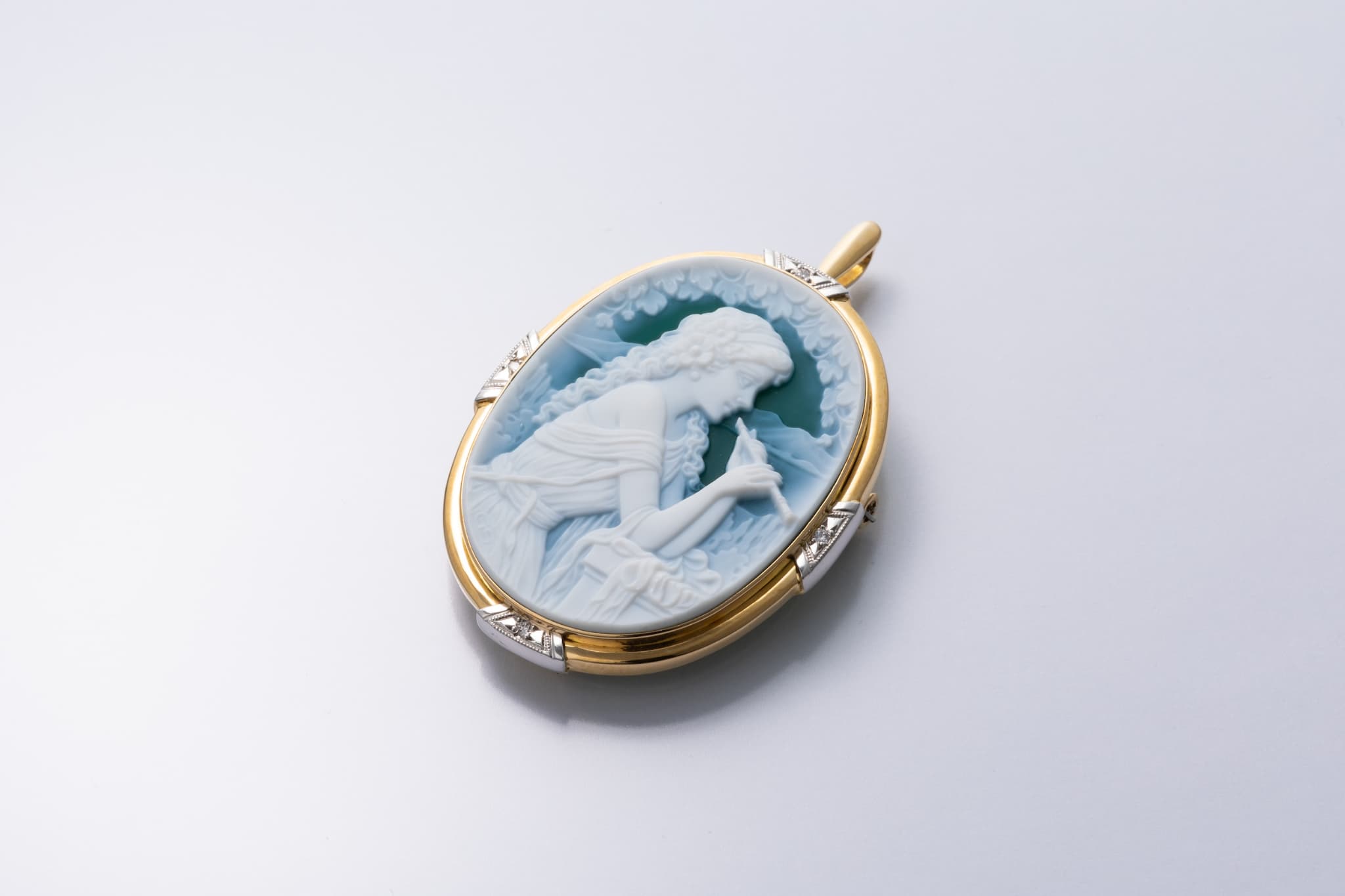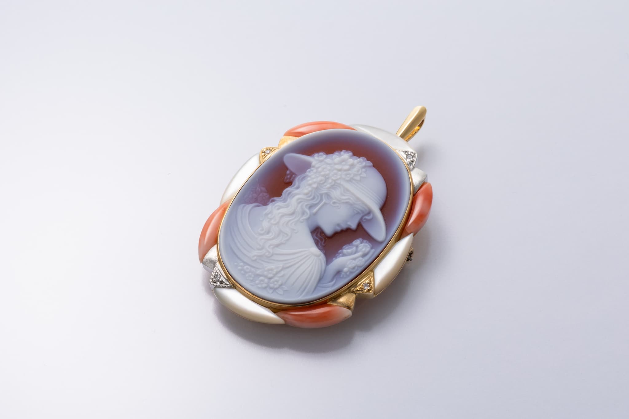 碼碯(メノウ)を用いたストーンカメオで、繊細かつなめらかな仕上がりの彫刻が特徴。限られた厚みの碼碯に表現されたモチーフは、浮き彫りにより立体的で奥行きのある世界観が表現され、高い芸術性と高貴な美しさを感じさせます。