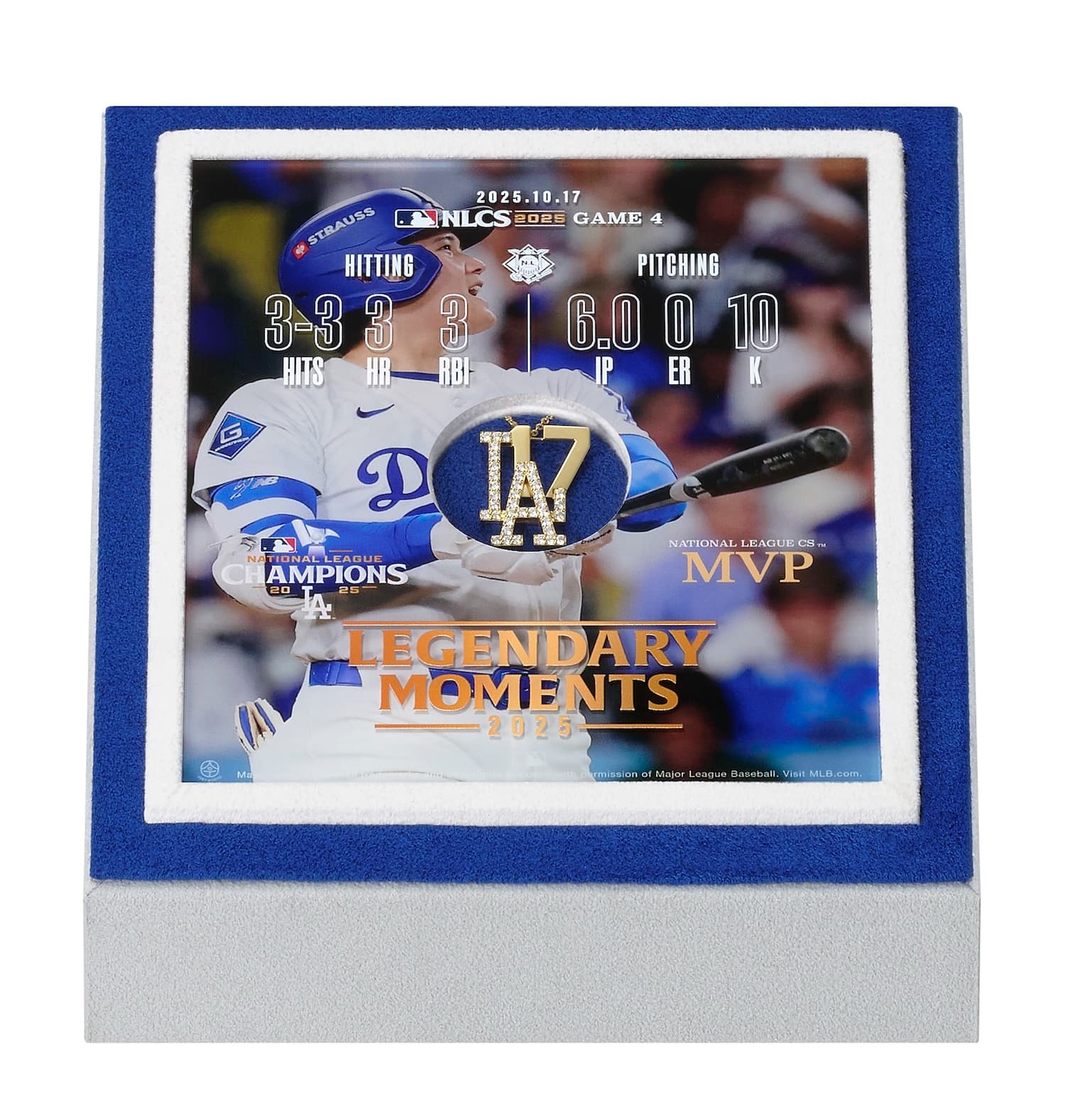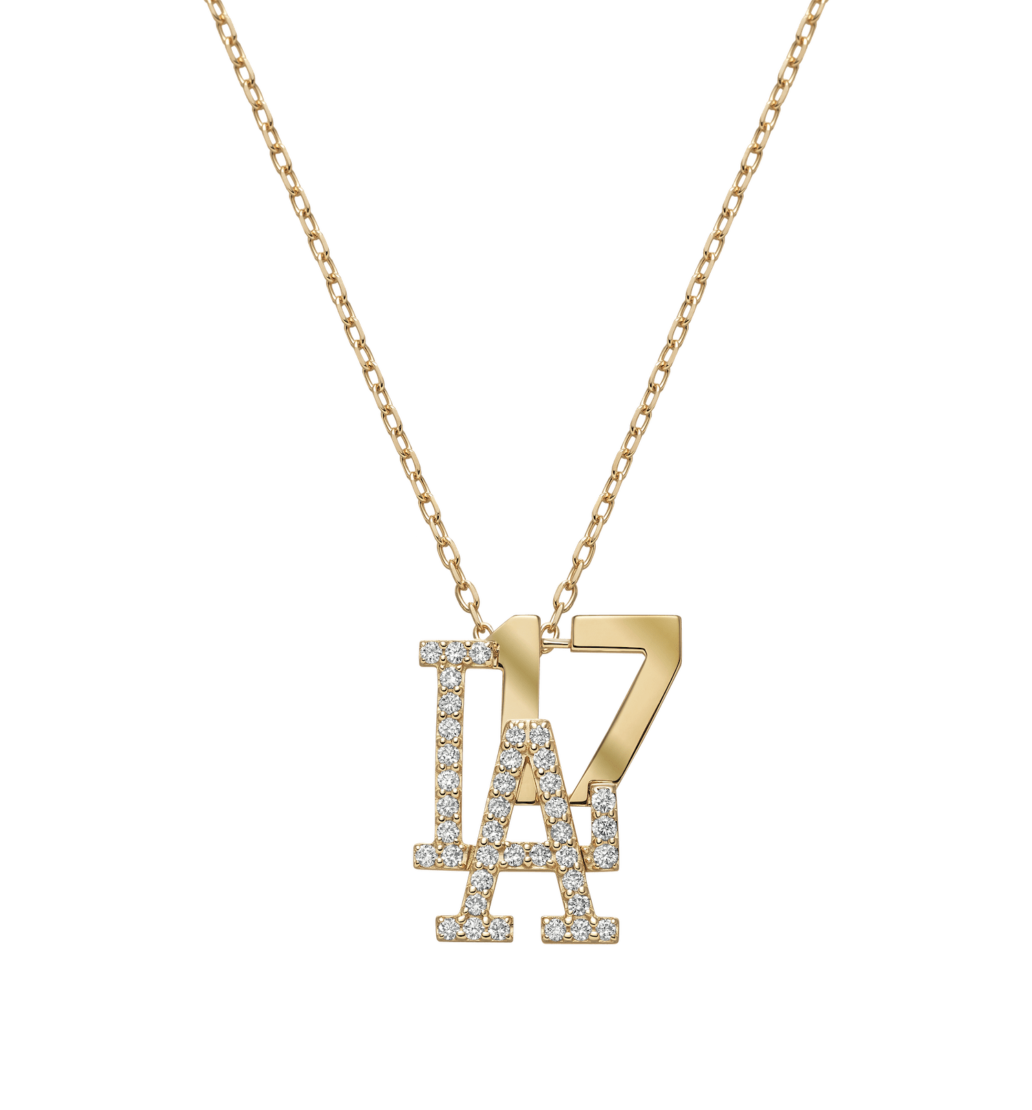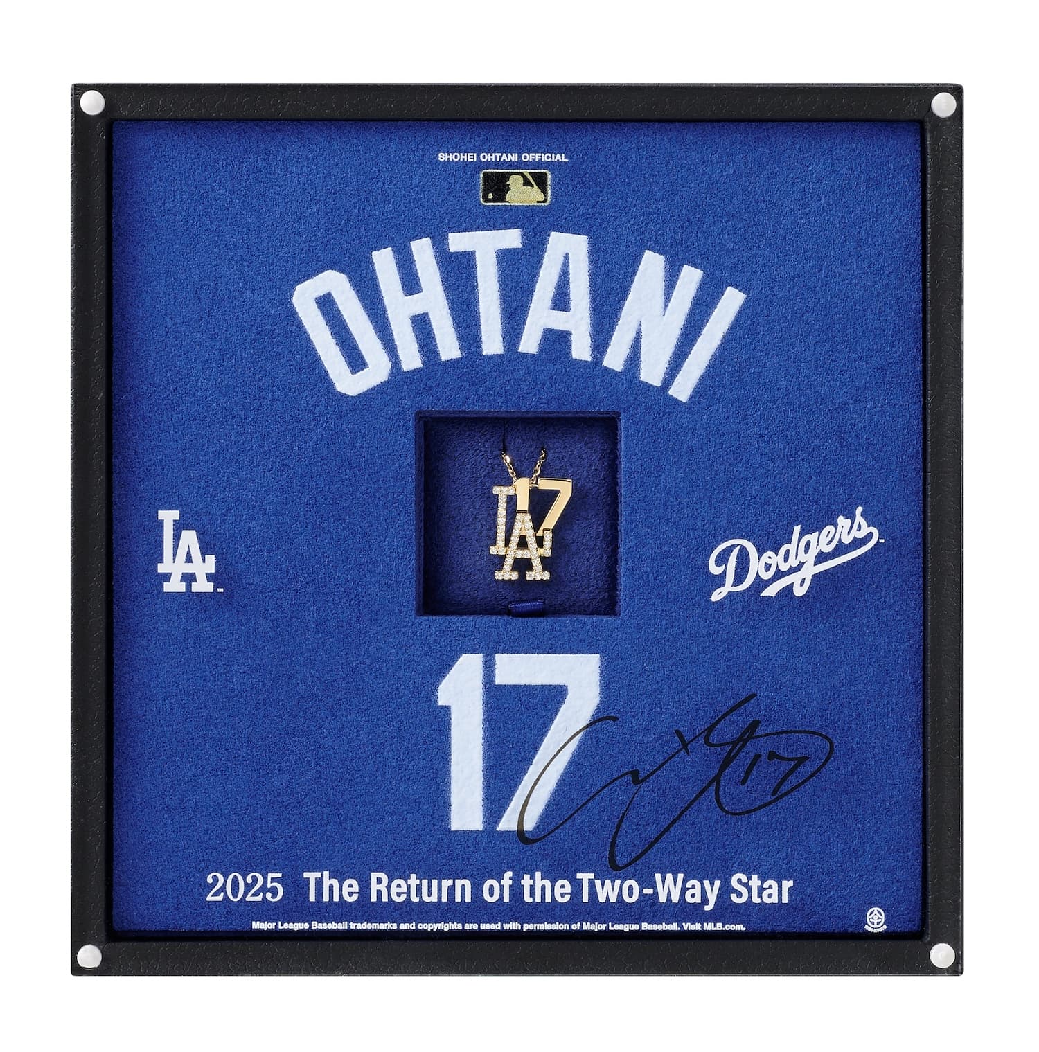 当アイテムは、ダイヤモンドで象った「LA」のメインロゴと、大谷選手の代名詞でもある背番号「17」を重ね合わせ、投打二刀流の復活を彷彿させるデザインに仕上げた特別記念ペンダントです。